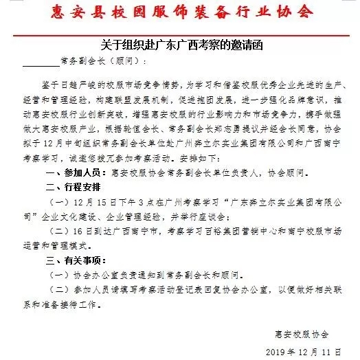 為學習和借鑒校服優(yōu)秀企業(yè)先進的生產(chǎn)、經(jīng)營和管理經(jīng)驗,構建聯(lián)盟發(fā)展機制,促進企業(yè)抱團發(fā)展,進一步強化品牌意識,推動惠安校服行業(yè)創(chuàng)新突破,增強惠安校服的行業(yè)影響力和市場競爭力,攜手做強做大惠安校服產(chǎn)業(yè),12月15~17日,惠安縣校園服飾裝備行業(yè)協(xié)會會員單位赴廣東、廣西進行考察交流活動?;顒悠陂g先后考察廣東奔立爾集團、廣東雅藝服飾、百裕集團