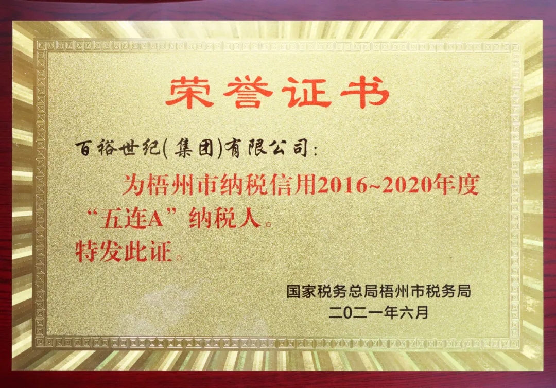 2021年6月,百裕世紀(jì)被國家稅務(wù)總局梧州市稅務(wù)局評定為梧州市納稅信用2016-2020年度“五連A”納稅人榮譽(yù)稱號,并頒發(fā)證書。