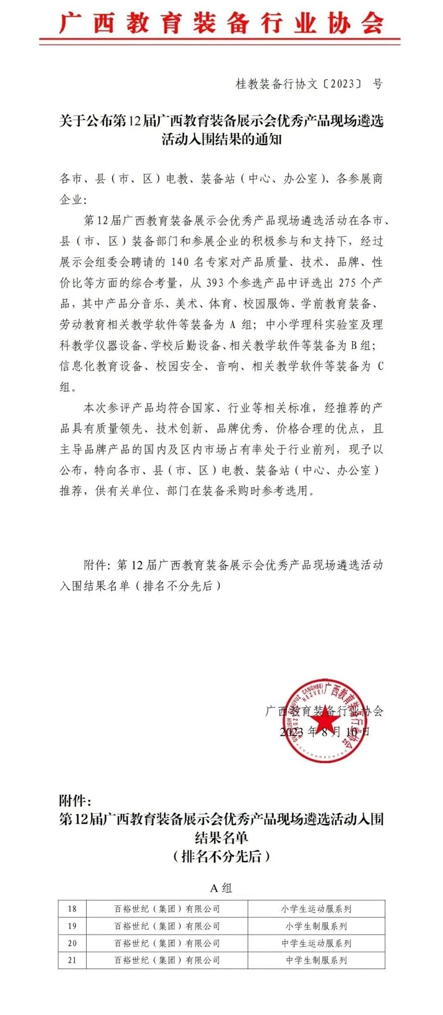 百裕世紀(集團)有限公司的4個校園服飾作品成功入選第12屆廣西教育裝備展示會優(yōu)秀產(chǎn)品推薦目錄,分別是小學(xué)生運動服系列、小學(xué)生制服系列、中學(xué)生運動服系列、中學(xué)生制服系列。