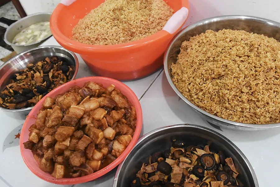后勤部精心為大家準(zhǔn)備了豐富的食材五花肉、雞蛋、香菇、魷魚、海蠣、綠豆,并根據(jù)員工喜好調(diào)配好兩種不同口味餡料。