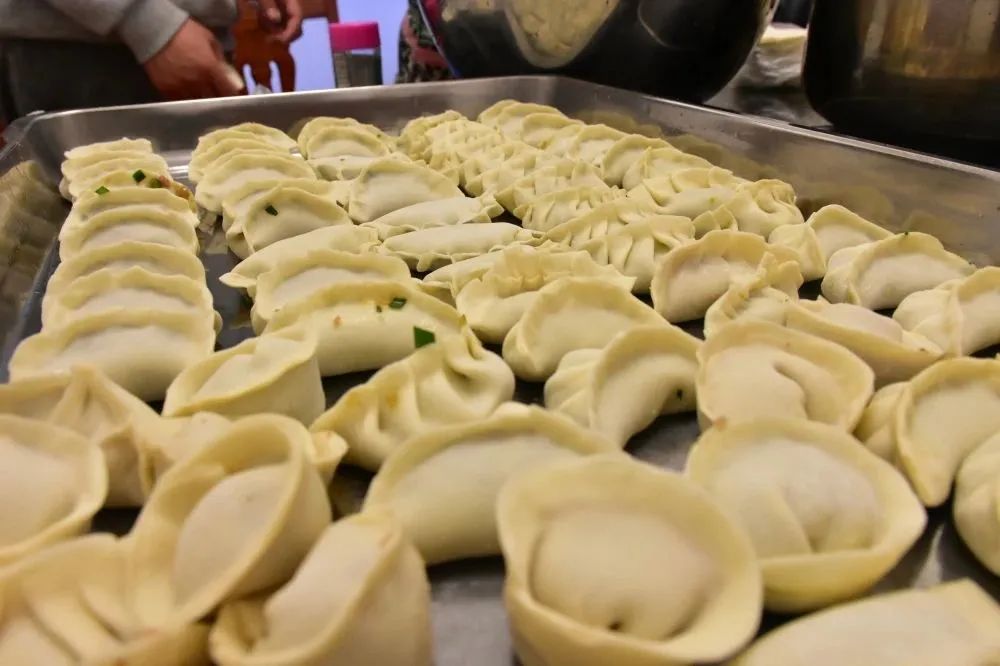 新春伊始,大家齊聚餐廳各顯神通,放餡、捏皮,完整連貫。一會(huì)兒功夫,一盤盤大小勻稱、緊實(shí)飽滿、形狀美觀的餃子整齊地?cái)[上了臺面:月牙狀、元寶狀、柳葉狀等各式各樣的餃子組成了一桌餃子“全家?!保氨染阑ǘ浒倩R放。