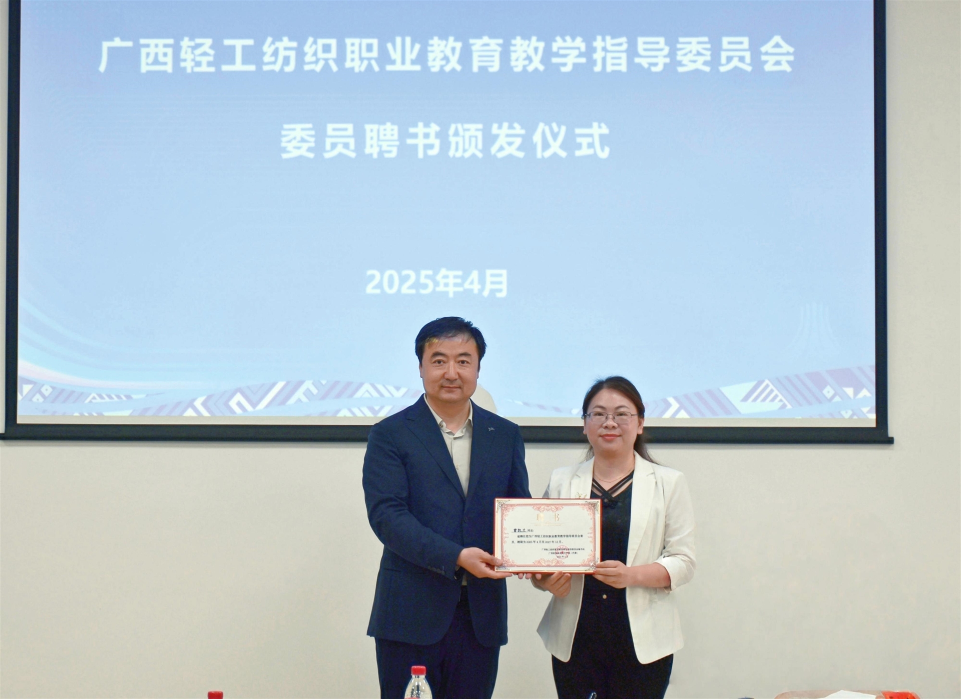 隨后,中國紡織服裝教育學(xué)會會長紀(jì)曉峰為百裕集團(tuán)等委員代表頒發(fā)了廣西輕工紡織職業(yè)教育教學(xué)指導(dǎo)委員會委員聘書。