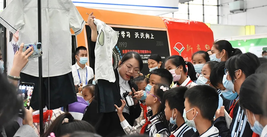 “百裕校園時代”以“科技創(chuàng)新、著裝育人、呵護明天、文化傳承”為品牌理念,切合當(dāng)代學(xué)生對校園服飾文化的需求,現(xiàn)場深受學(xué)生們的關(guān)注,現(xiàn)場人頭攢動,圍成了一個小型講堂。