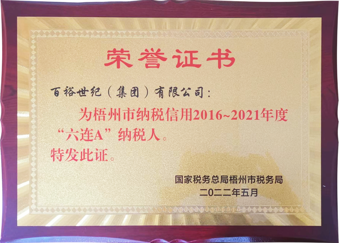 近日,經(jīng)國家稅務(wù)總局梧州市稅務(wù)局評審,百裕世紀(jì)(集團)有限公司被評為2016~2021年度“六連A”納稅人,這是我們堅持依法、誠信經(jīng)營的實質(zhì)成果。