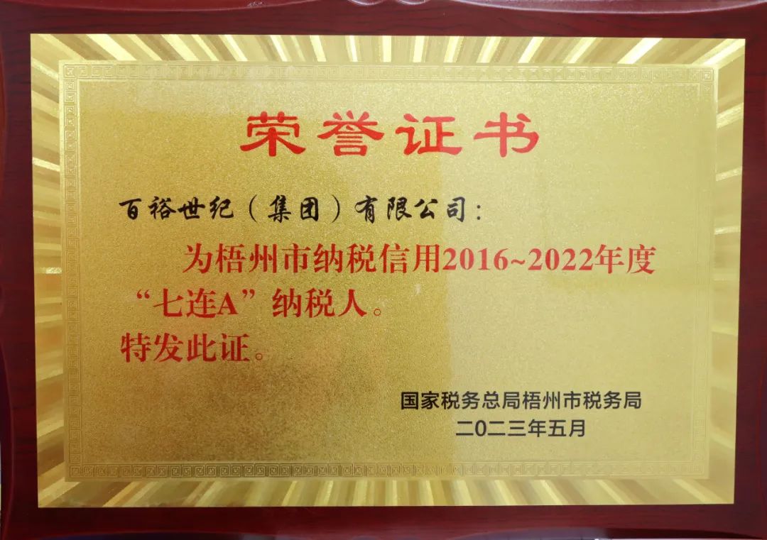 近日,經國家稅務總局梧州市稅務局評審,百裕世紀(集團)有限公司被評為2016~2022年度“七連A”納稅人,這是我們堅持依法、誠信經營的實質成果。