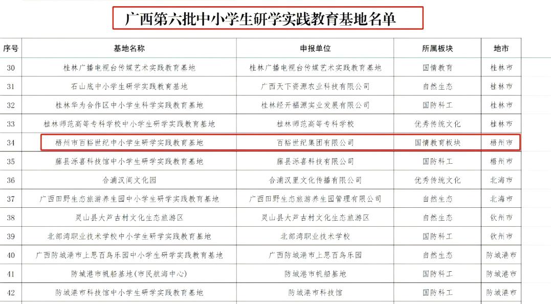 根據(jù)《自治區(qū)教育廳關(guān)于開展2024年全區(qū)中小學(xué)生研學(xué)實(shí)踐教育系列評(píng)選活動(dòng)的通知》(桂教基教〔2024〕13號(hào))要求,自治區(qū)教育廳組織各地開展廣西第六批中小學(xué)生研學(xué)實(shí)踐教育基(營)地和2024年中小學(xué)生研學(xué)實(shí)踐教育精品課程(線路)申報(bào)推薦工作。百裕世紀(jì)(集團(tuán))有限公司入選廣西第六批中小學(xué)生研學(xué)實(shí)踐教育基地名單。
