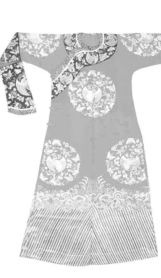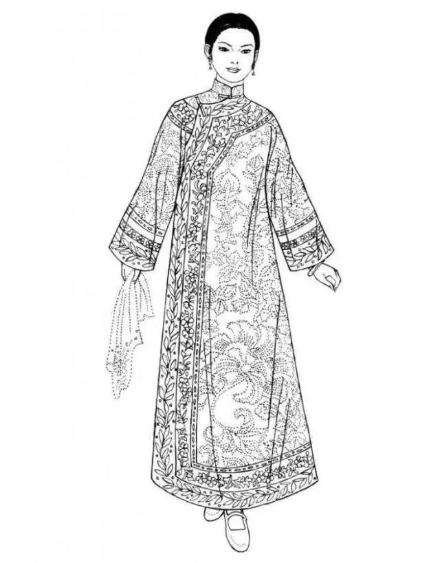 清朝后期,旗女(滿洲女子)所穿的長袍,衣身較為寬博,造型線條平直硬朗,衣長至腳踝?!霸獙氼I”用得十分普遍,領高蓋住腮碰到耳,袍身上多繡以各色花紋,領、袖、襟、裾都有多重寬闊的滾邊。同治年間,鑲、滾技藝達到高峰時期,有的甚至整件袍服全用刺繡、花邊鑲滾,幾乎難以辨認原本的衣料。旗女袍服的裝飾繁瑣至登峰造極的程度,從另一個方面也凸顯了強權霸主的欲望。