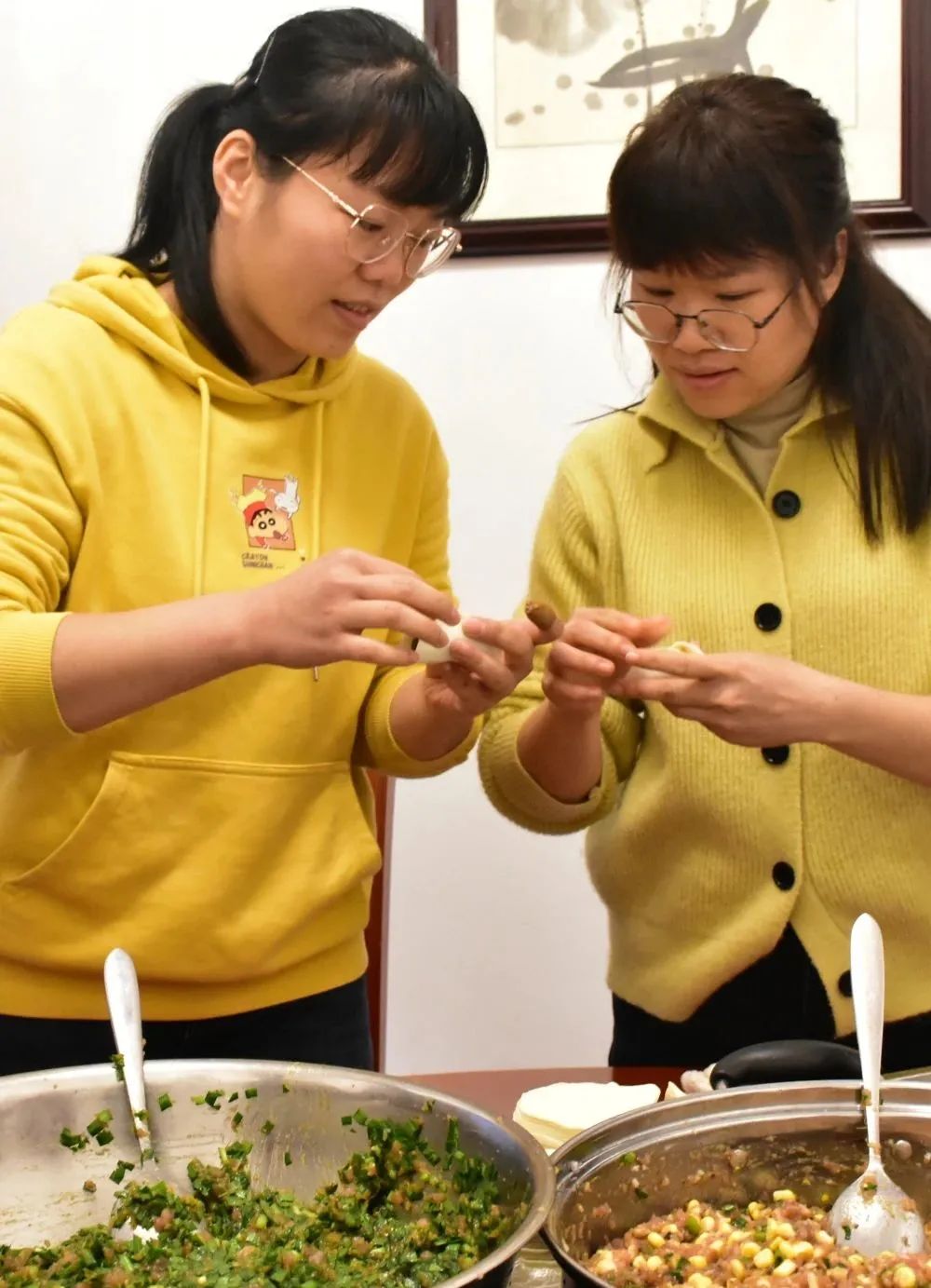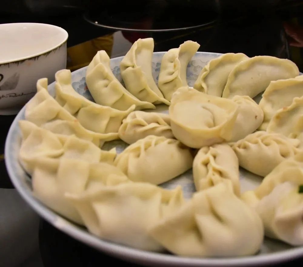 新春伊始,大家齊聚餐廳各顯神通,放餡、捏皮,完整連貫。一會(huì)兒功夫,一盤盤大小勻稱、緊實(shí)飽滿、形狀美觀的餃子整齊地?cái)[上了臺(tái)面:月牙狀、元寶狀、柳葉狀等各式各樣的餃子組成了一桌餃子“全家?!保氨染阑ǘ浒倩R放。