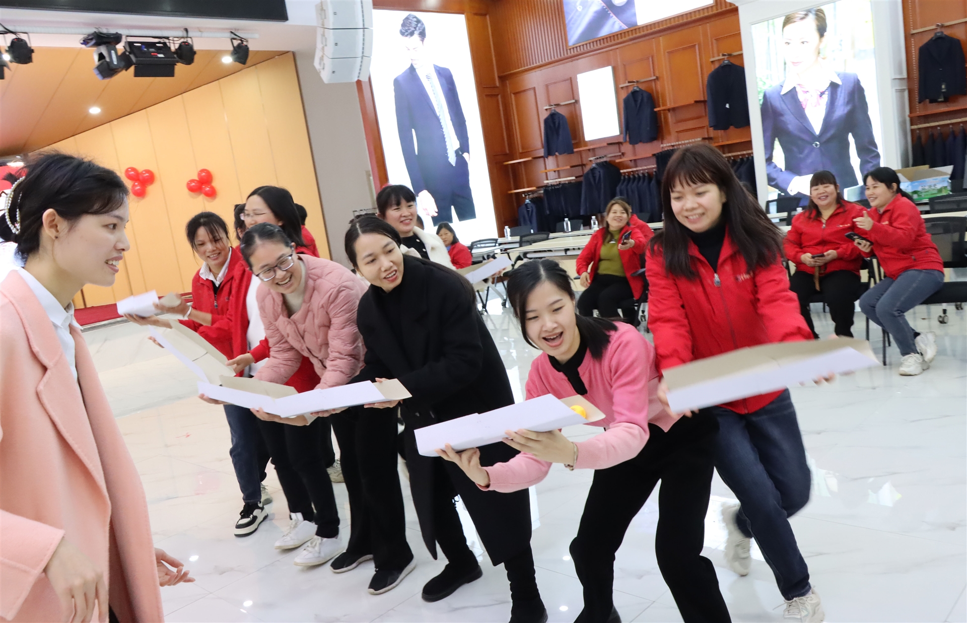 搶凳子比賽中,女士們仿佛變身為矯健的豹子,眼中閃爍著競(jìng)爭(zhēng)的光芒。而珠行萬(wàn)里活動(dòng)則更像是她們展示優(yōu)雅與力量的舞臺(tái),每一次珠子的傳遞都伴隨著她們的歡笑和尖叫。整個(gè)會(huì)議室仿佛被她們的熱情點(diǎn)燃,熱鬧喜慶的氣氛彌漫在每個(gè)角落。會(huì)議室洋溢著熱鬧喜慶的氣氛,展現(xiàn)了新時(shí)代女性的時(shí)代風(fēng)彩。